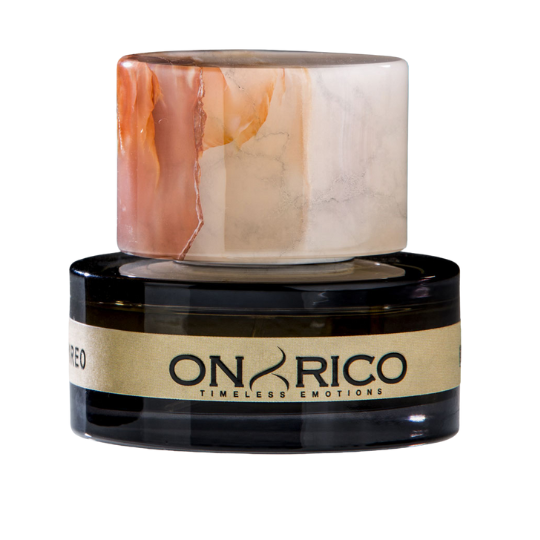 Il flacone è chiuso da un tappo di pregiatissimo Onice Rosa. Le sue naturali striature ricordano le nuvole del cielo al tramonto.